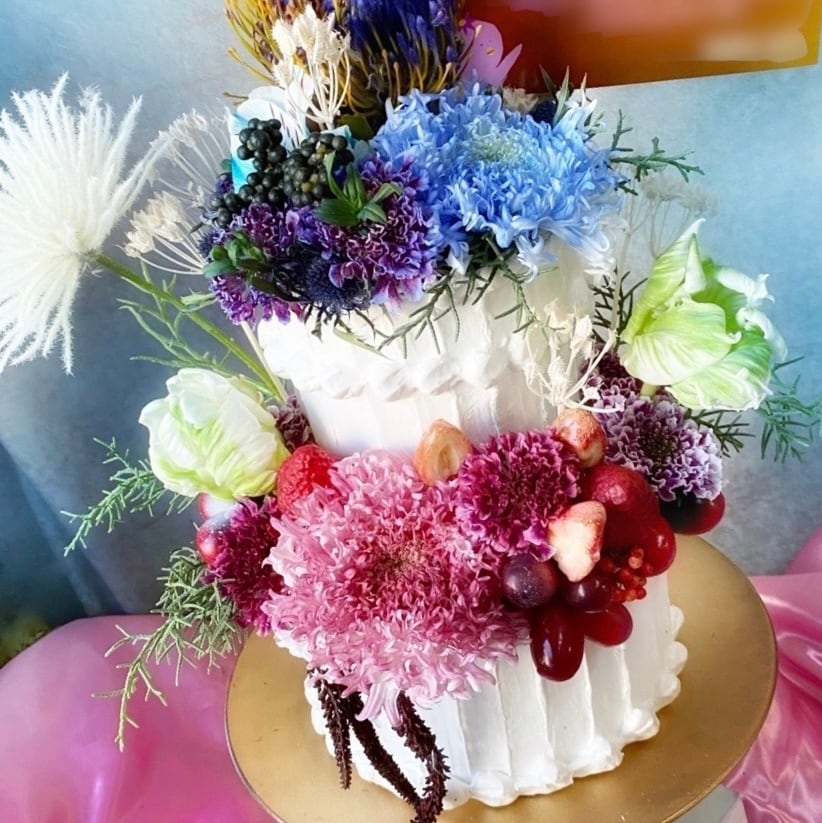 本物のケーキに寄せた食品サンプルのようなケーキアレンジ。