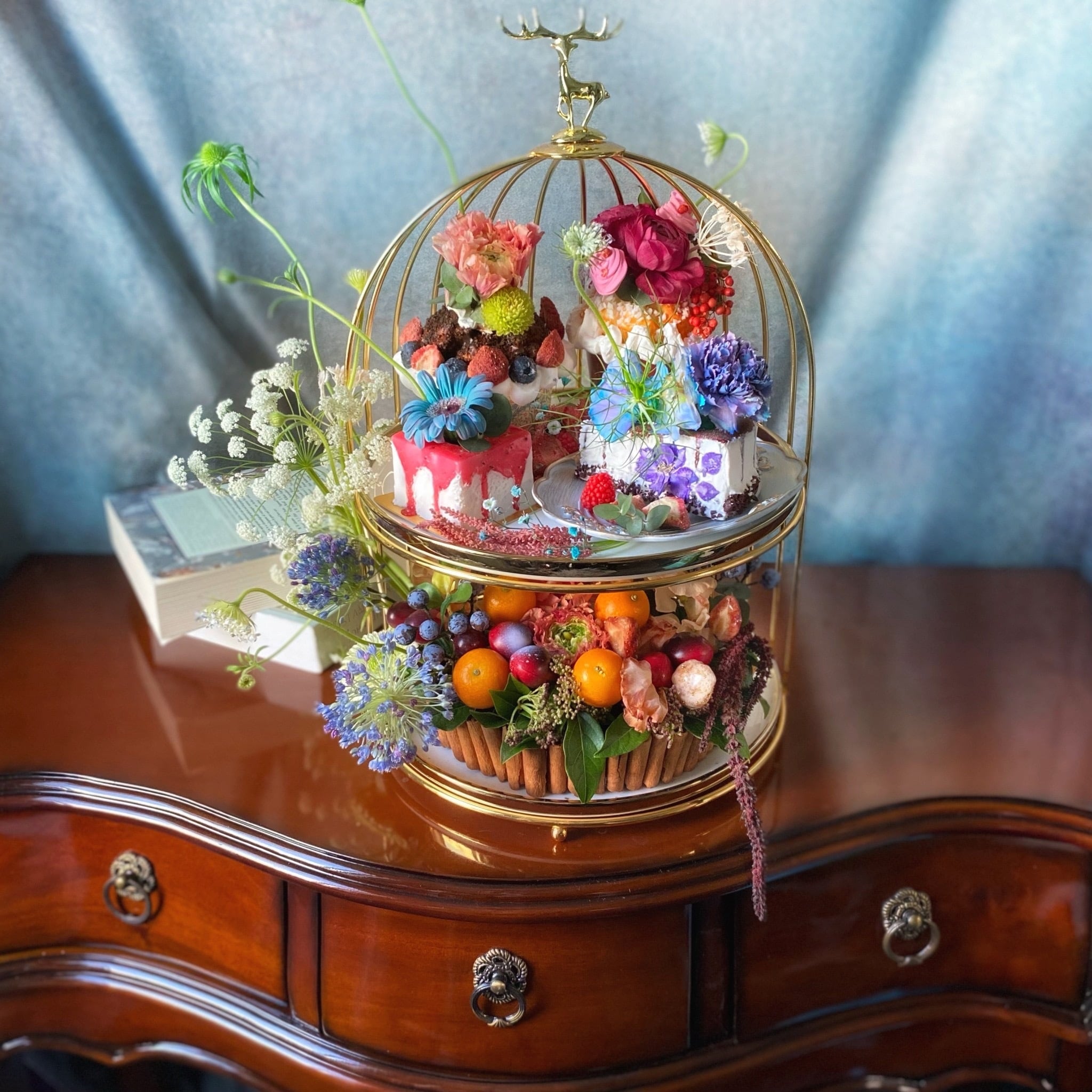 本物のケーキに寄せた食品サンプルのようなケーキアレンジ。